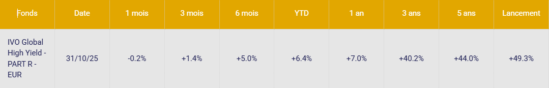Créé en décembre 2019, le fonds IVO Global High Yield est un OPCVM investi en obligations à haut rendement, sans contrainte de notation ni de devise, sur les marchés développés et émergents. Sa gestion discrétionnaire repose sur une sélection fondamentale de titres sur les marchés obligataires mondiaux (« bond picking »), appuyée par une analyse macroéconomique. Le fonds combine une stratégie de « carry » (valorisation du rendement) et de « total return » (potentiel d’appréciation en capital).